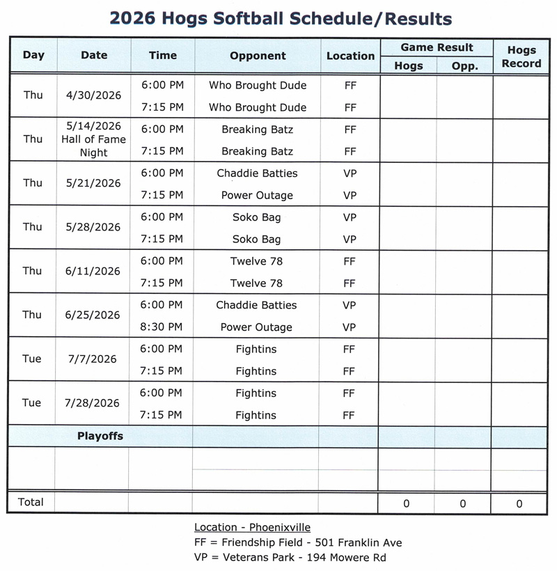 Also, thanks to The GridIron for the laughs, comraderies, beer, wings and pizza (even on Bingo nights). So, another summer of Hogs Softball swiftly passes with fond memories and future promises for our 47th installment in 2026.